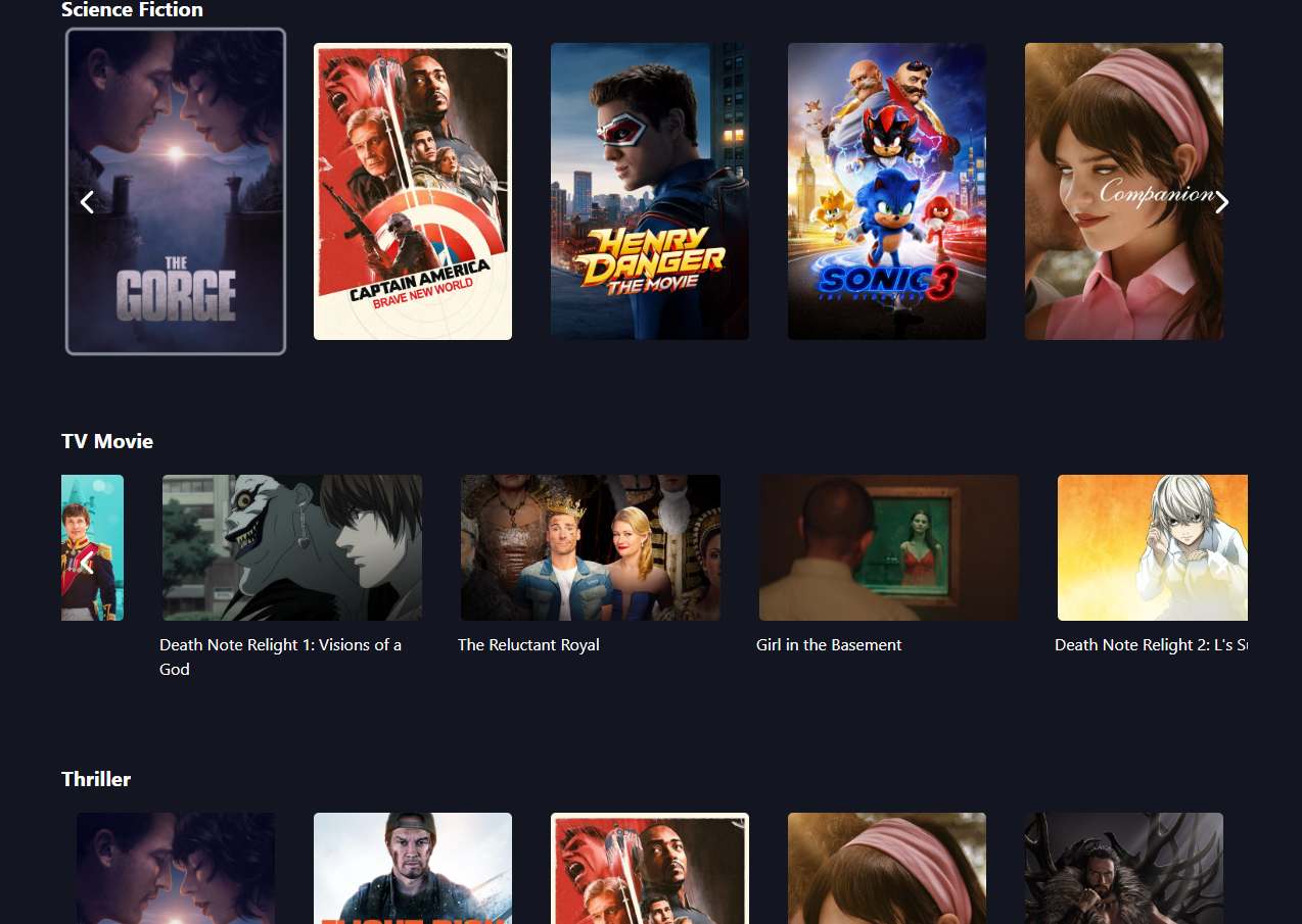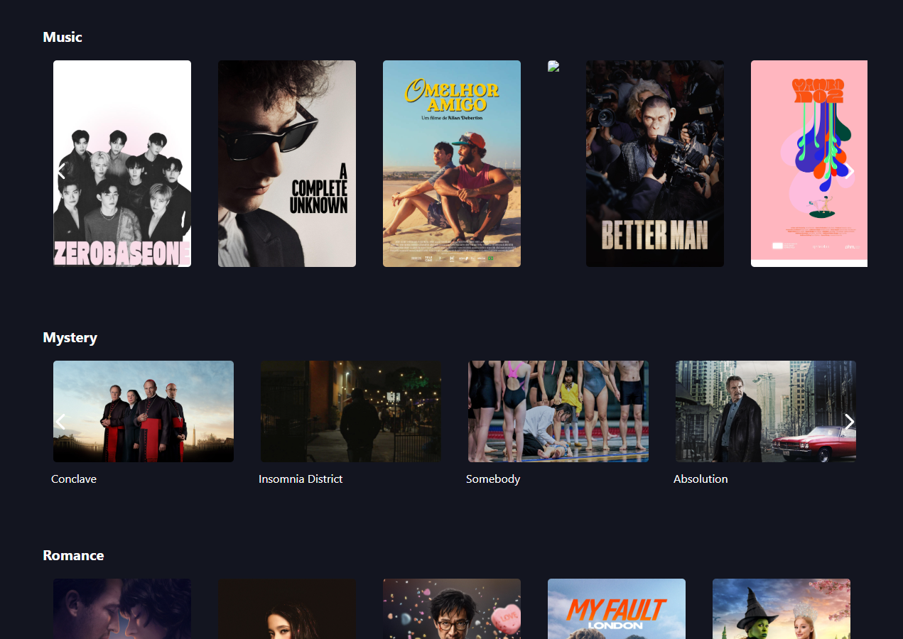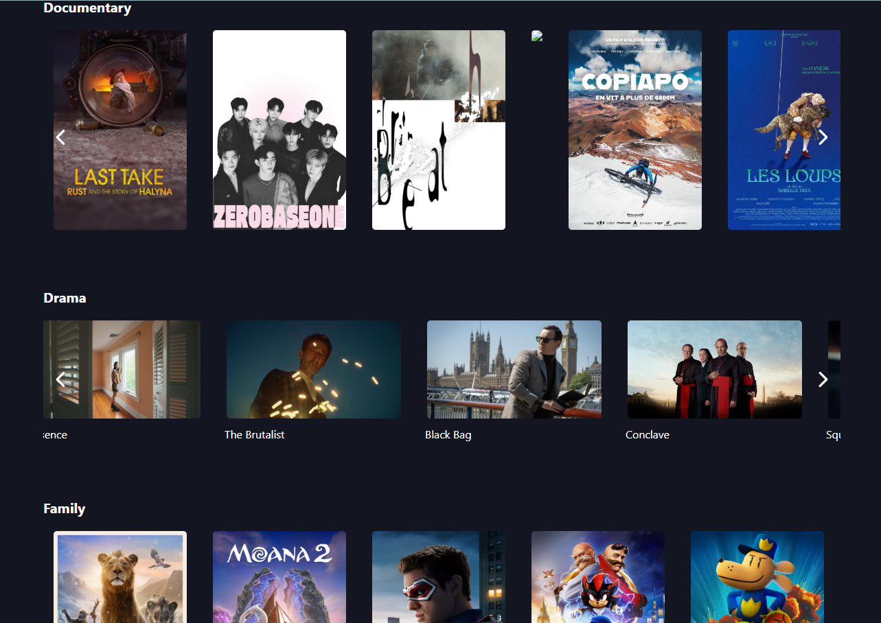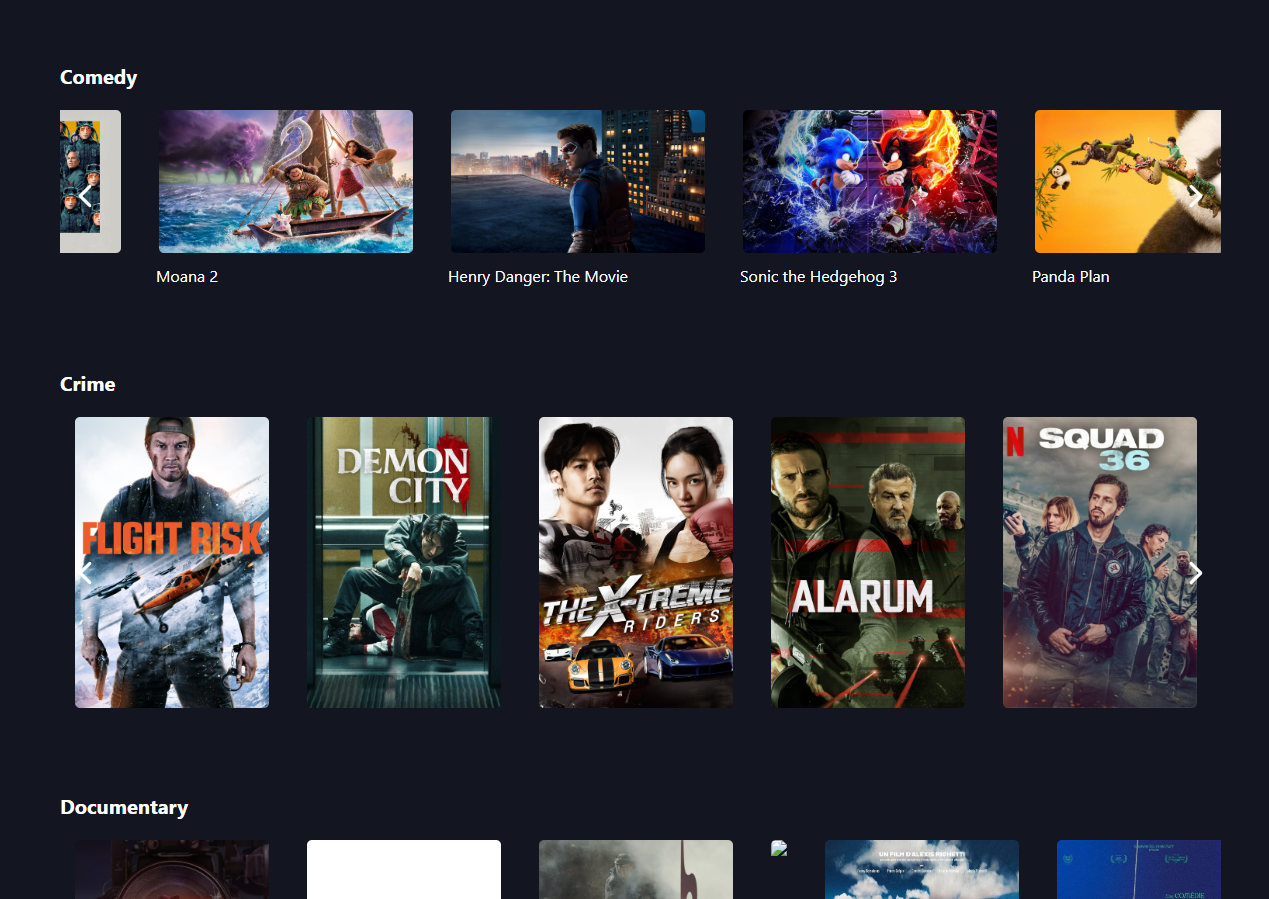 Home Page: Designed a home page featuring a responsive carousel showcasing featured content, along with categorized sections for movies and TV shows.
