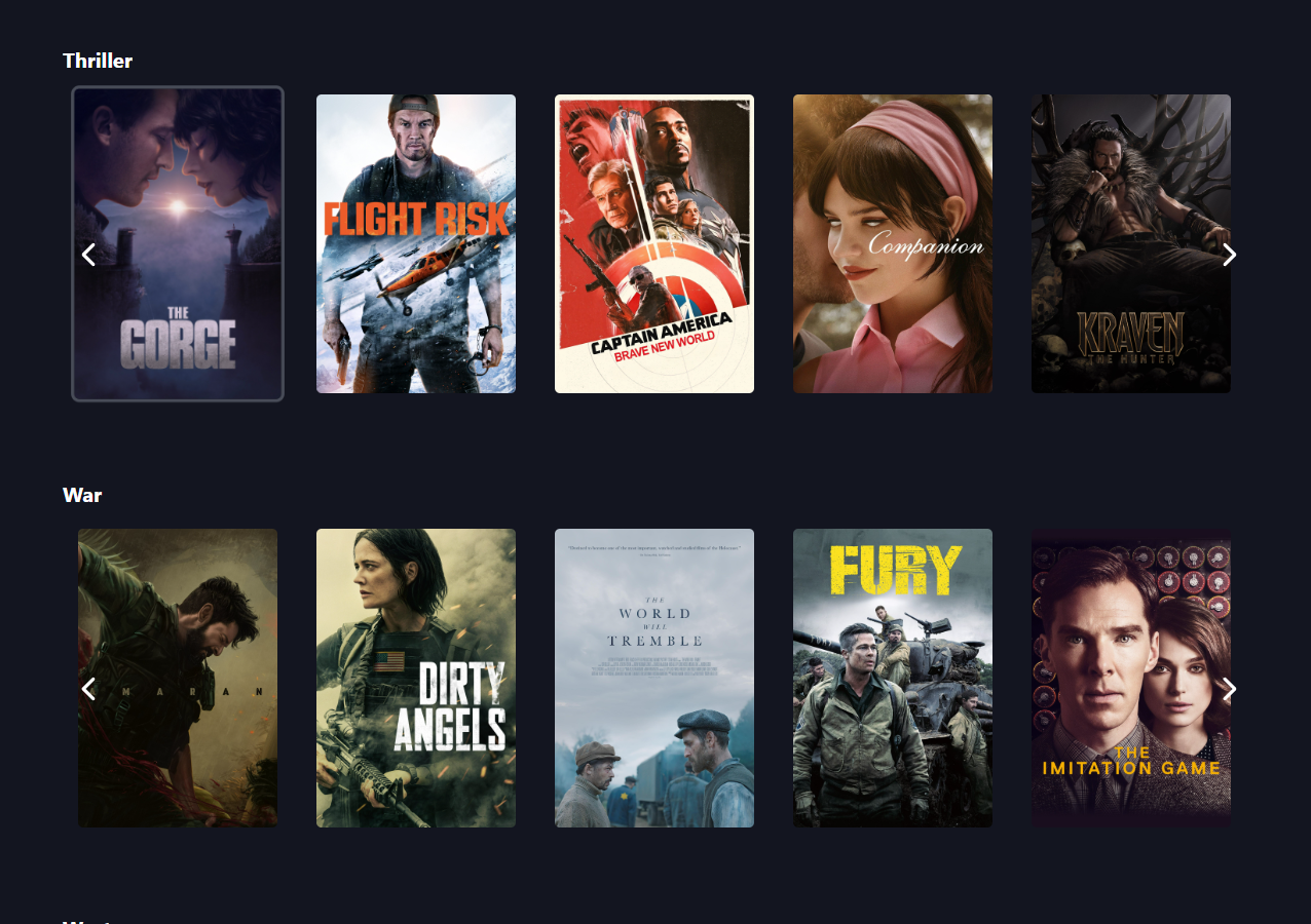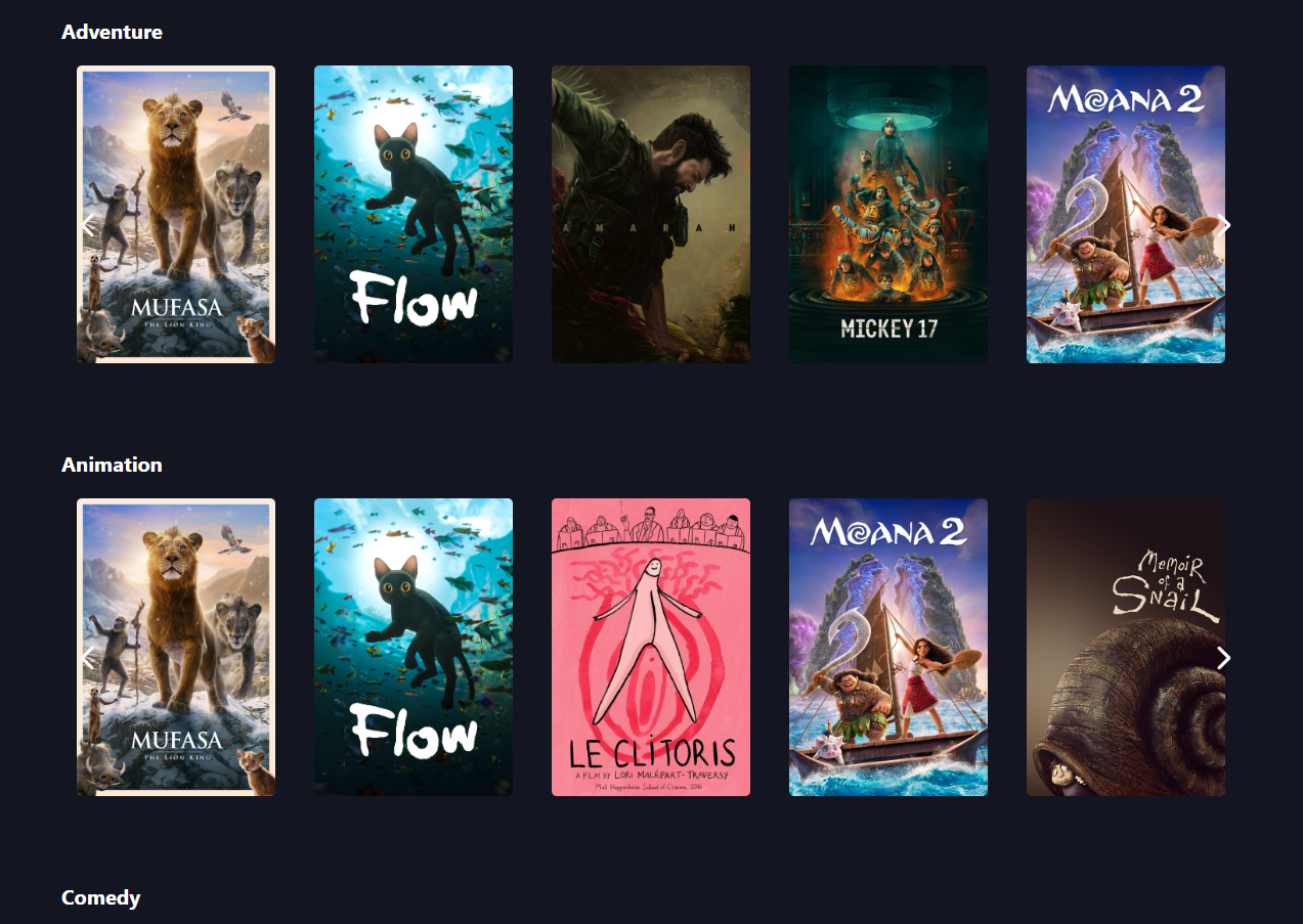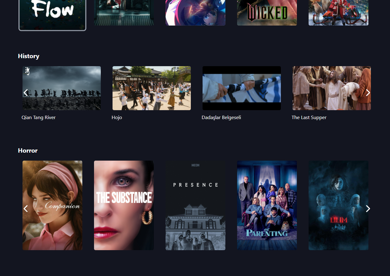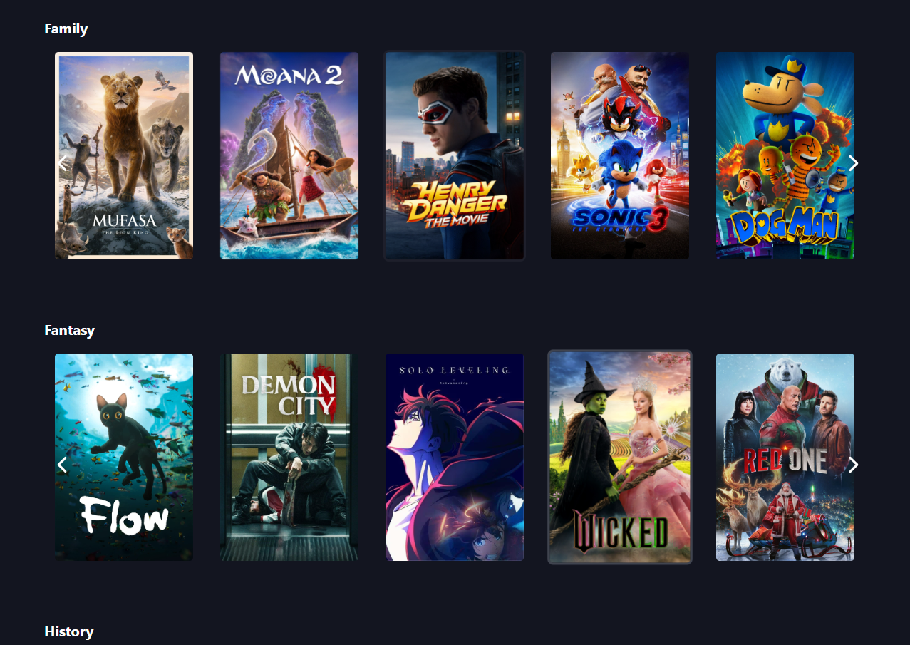 Home Page: Designed a home page featuring a responsive carousel showcasing featured content, along with categorized sections for movies and TV shows.