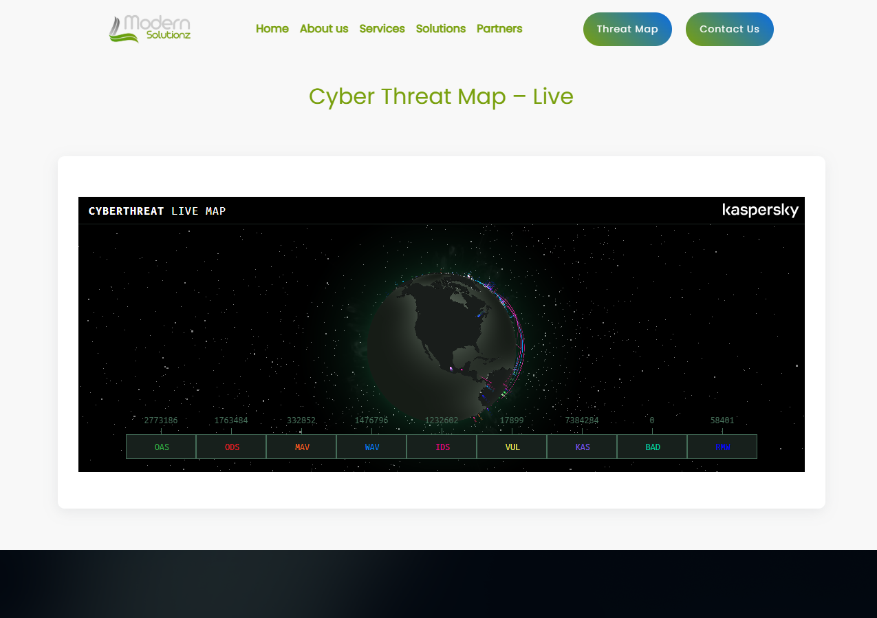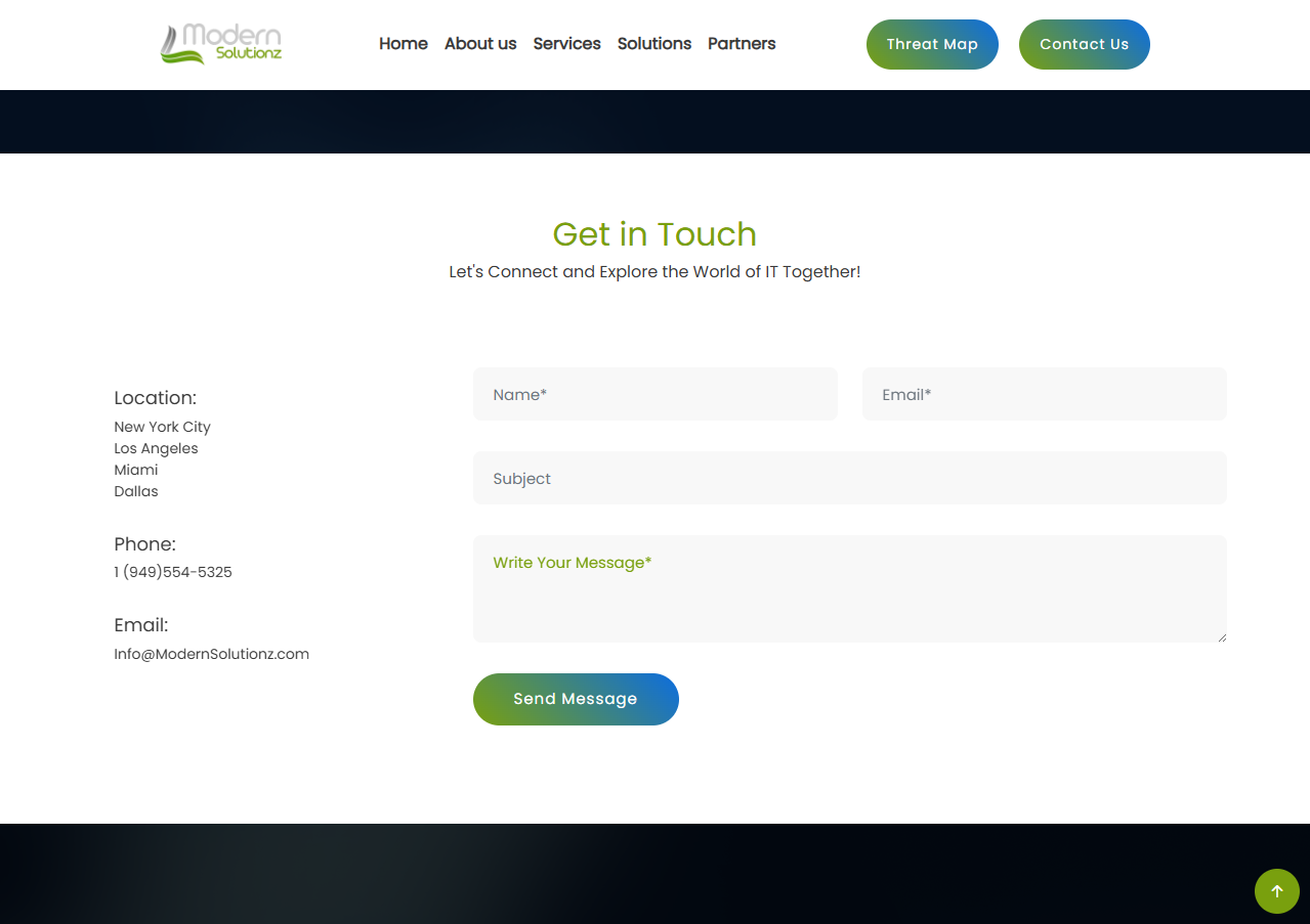 • User-Friendly Interface: Designed an intuitive layout with clear navigation to sections such as Home, About Us, Services, Solutions, Partners, Threat Map, and Contact Us.