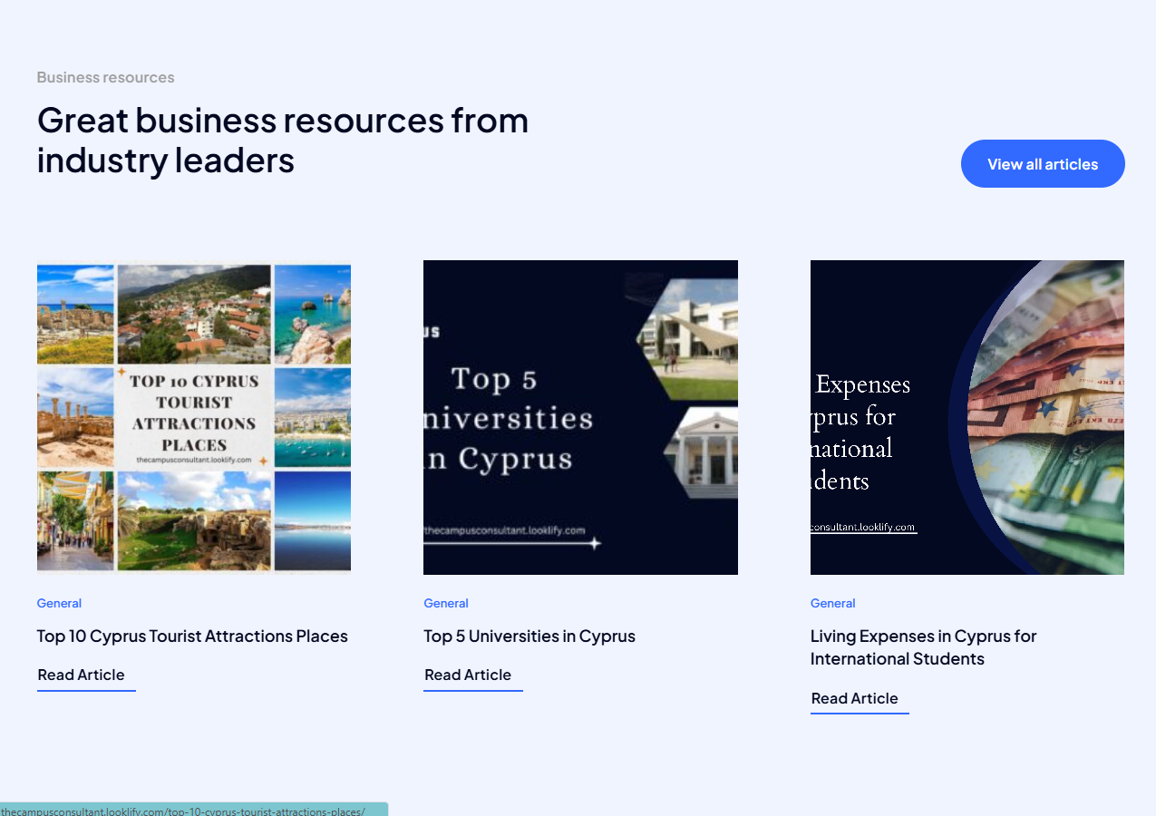 - Business Resources: Created a section offering valuable resources such as articles on top universities, living expenses for international students, and tourist attractions to assist clients in making informed decisions.