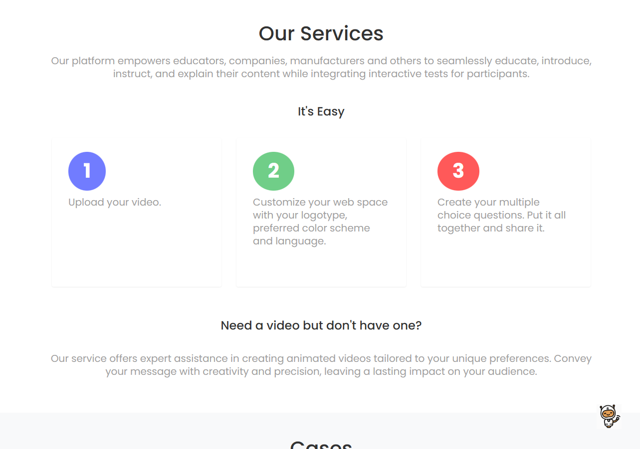 Your Ecourse is an innovative platform designed to empower educators, companies, and manufacturers to seamlessly create and share e-learning content integrated with interactive tests. The platform offers a user-friendly interface for uploading videos, customizing web spaces, and creating multiple-choice questions, enhancing the learning experience for participants.